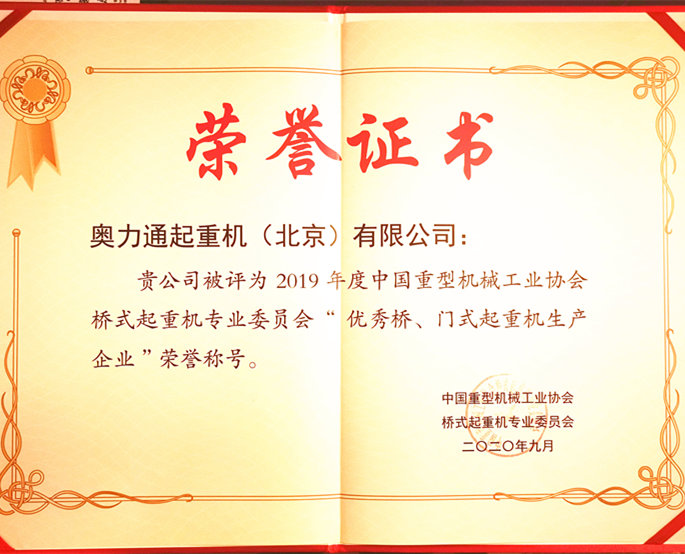 十月是个美好的月份,也是秋高气爽的好日子,金桂飘香,硕果累累,是有耕耘、有收获的季节。协会为表扬先进、树立典型、引领和推动行业向更高层次发展,对年度“优秀桥、门式起重机生产企业”进行了隆重表彰。YABO鸭脖起重机(北京)有限公司有幸荣获2019年度“优秀桥、门式起重机生产企业”荣誉称号。