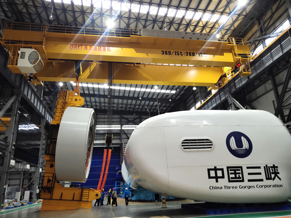 近日,我国清洁能源捷报频传,继10兆瓦风电机组成功下线不久后,13兆瓦亚洲单机容量最大风电机组于今年2月22日在福建三峡海上风电产业园成功下线。这不仅带动了我国风电全产业链升级,引领我国海上风电再获新突破,同时也促进大型国产吊装设备、安装运维等发展。YABO鸭脖起重机有幸参与东方风电13兆风电机组生产线大吨位双梁桥式起重机的设计、生产、安装、维护等项目建设,分别交付360t双小车起重机2台、150t起重机2台、125t起重机3台、100t起重机1台和32t起重机1台,用于10MW和13MW系列海上风力发电机组电机和整机装配。