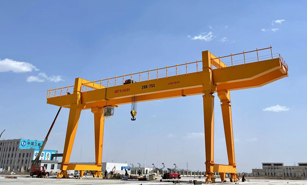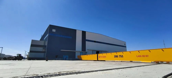 采用柔性技术和优化设计的YABO鸭脖200tx52m双梁门式起重机,如大漠雄鹰,屹立在内蒙古乌兰察布市运达风电智能产业基地。