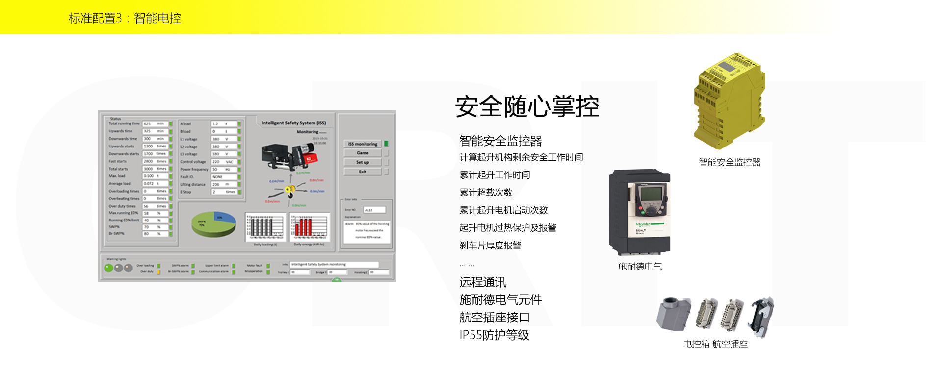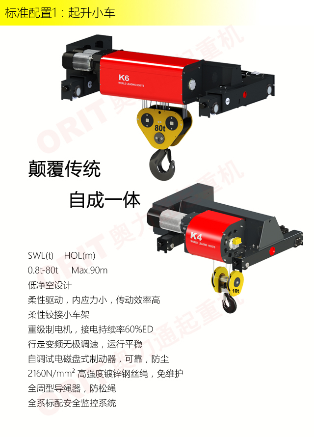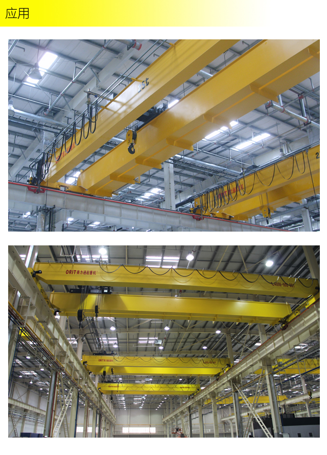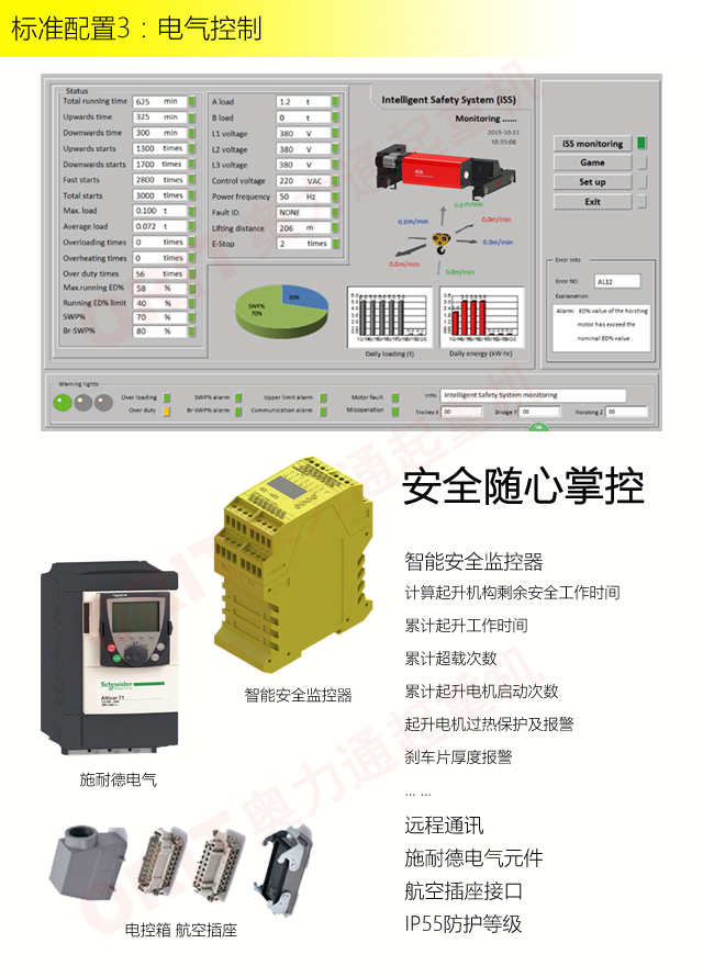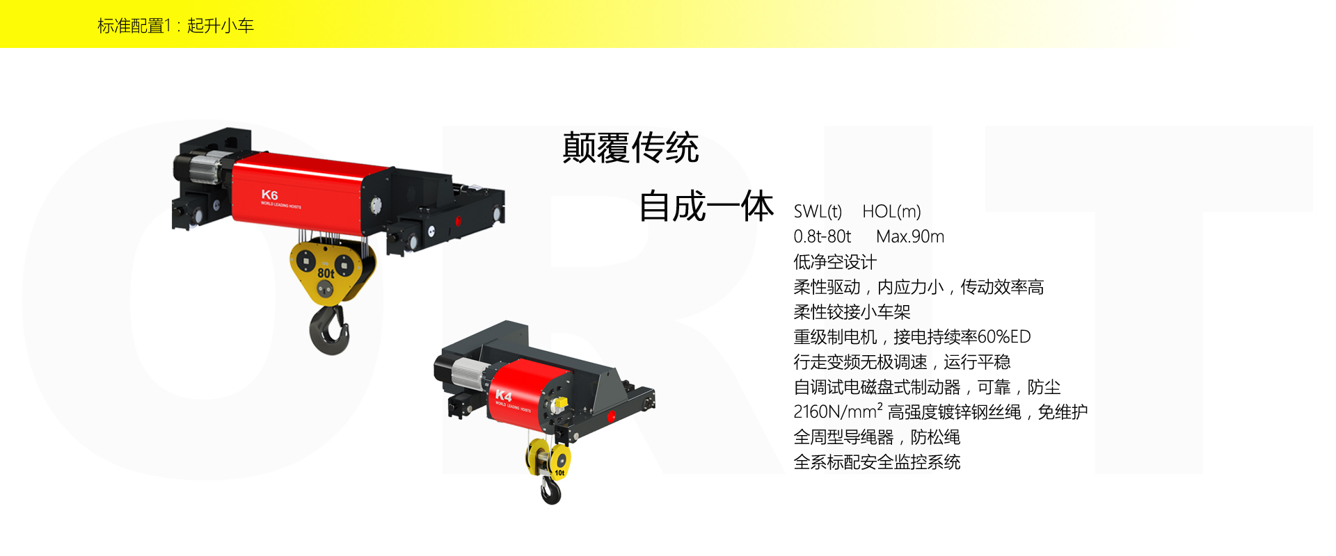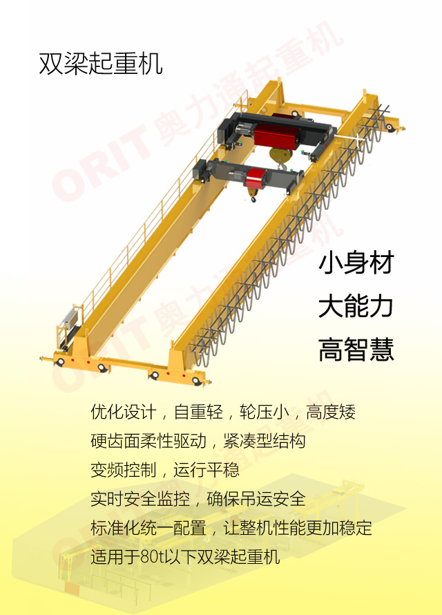 产品名称:双梁桥式起重机 小身材、大能力、高智慧 优化设计,自重轻,轮压小,高度矮 硬齿面柔性驱动,紧凑型结构 变频控制,运行平稳 实时安全监控,确保吊运安全 标准化配置,让性能无比稳定 适用于80t以下双梁起重机 标准配置1:起升机构 颠覆传统,自成一体 SWL(t) HOL(m) 0.8t-80t Max.90m 低净空设计 柔性驱动,内应力小,传动效率高 柔性铰接小车架 重级制电机,接电持续率60%ED 行走变频无极调速,运行平稳 自调试电磁盘式制动器,可靠,防尘 2160N/mm² 高强度镀锌钢丝绳,免维护 全周型导绳器,防松绳 全系标配安全监控系统 标准配置2:三合一驱动 静音科技,静享搬运 结构紧凑,铝合金壳体,密封 变频电机+硬齿面减速箱+盘式制动器 三合一集成化设计 全变频调速 最高转速4800 r/min 防护等级IP55 半油脂润滑,免维护 静音科技,静享搬运 标准配置3:电控系统 安全随心掌控 智能安全监控器 计算起升机构剩余安全工作时间 累计起升工作时间 累计超载次数 累计起升电机启动次数 起升电机过热保护及报警 刹车片厚度报警 ... ... 远程通讯 施耐德电气元件 航空插座接口 IP55防护等级 标准配置4:端梁 多变灵活,适应自如 模块化直驱设计 自重轻、体积小 多种连接方式,安装尺寸灵活 适用各种厂房,降低厂房高度 QT700车轮,自润滑,更静音 采用调心轴承,适应更自如 应用