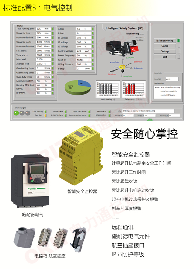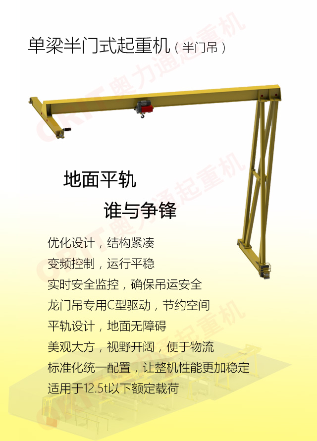 产品名称:半门式起重机 优化设计,结构紧凑 变频控制,运行平稳 实时安全监控,确保吊运安全 龙门吊专用C型驱动,节约空间 平轨设计,地面无障碍 美观大方,视野开阔,便于物流 标准化配置,让性能无比稳定 适用于12.5t以下额定载荷 标准配置1:起升机构 颠覆传统,自成一体 低净空设计 柔性驱动,内应力小,传动效率高 重级制电机,接电持续率60%ED 行走变频无极调速,运行平稳 自调试电磁盘式制动器,可靠,防尘 2160N/mm² 高强度镀锌钢丝绳,免维护 全周型导绳器,防松绳 全系标配安全监控系统 标准配置2:三合一驱动 静音科技,静享搬运 结构紧凑,铝合金壳体,密封 变频电机+硬齿面减速箱+盘式制动器 龙门专用C型三合一集成化设计,节约空间 全变频调速 最高转速4800 r/min 防护等级IP55 半油脂润滑,免维护 静音科技,静享搬运 标准配置3:电控系统 安全随心掌控 智能安全监控器 计算起升机构剩余安全工作时间 累计起升工作时间 累计超载次数 累计起升电机启动次数 起升电机过热保护及报警 刹车片厚度报警 ... ... 远程通讯 施耐德电气元件 航空插座接口 IP55防护等级 标准配置4:端梁 多变灵活,适应自如 模块化直驱设计 自重轻、体积小 多种连接方式,安装尺寸灵活 适用各种厂房,降低厂房高度 QT700车轮,自润滑,更静音 采用调心轴承,适应更自如 独特的平轨设计,地面无死角,物流无障碍 平轨半门式起重机,工业设计的匠心所在